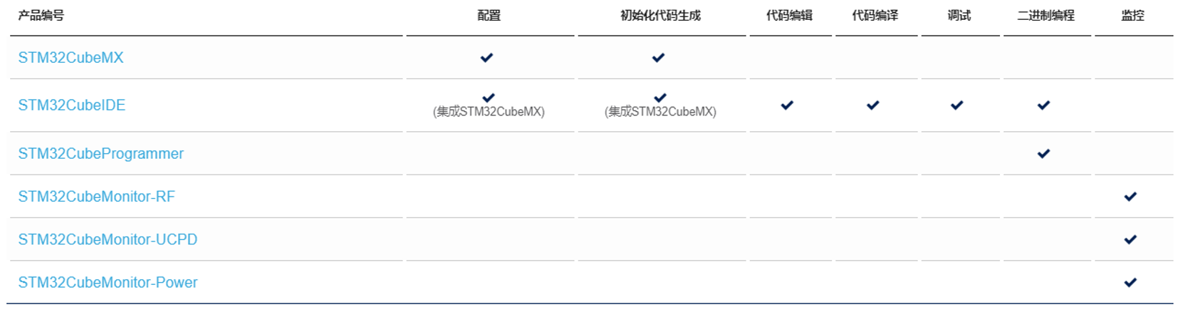 可以看出,ST公司已经针对STM32系列芯片提供了完整解决方案。STM32CubeMX完成芯片配置和工程代码初始化。STM32CubeIDE完成代码编辑、功能实现。STM32CubeProgrammer完成代码烧写。STM32CubeMonitor完成监控、功能验证。