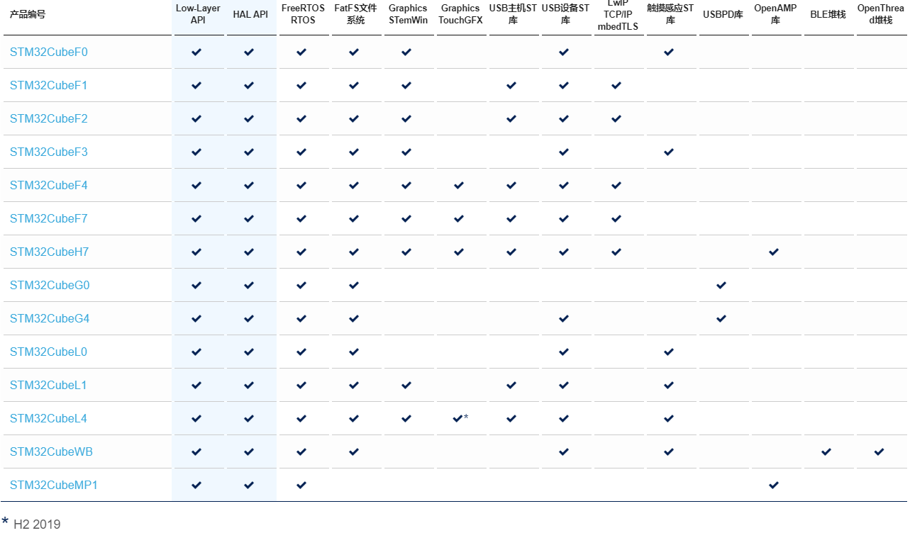 STM32Cube嵌入式软件的MCU软件包支持功能列表。