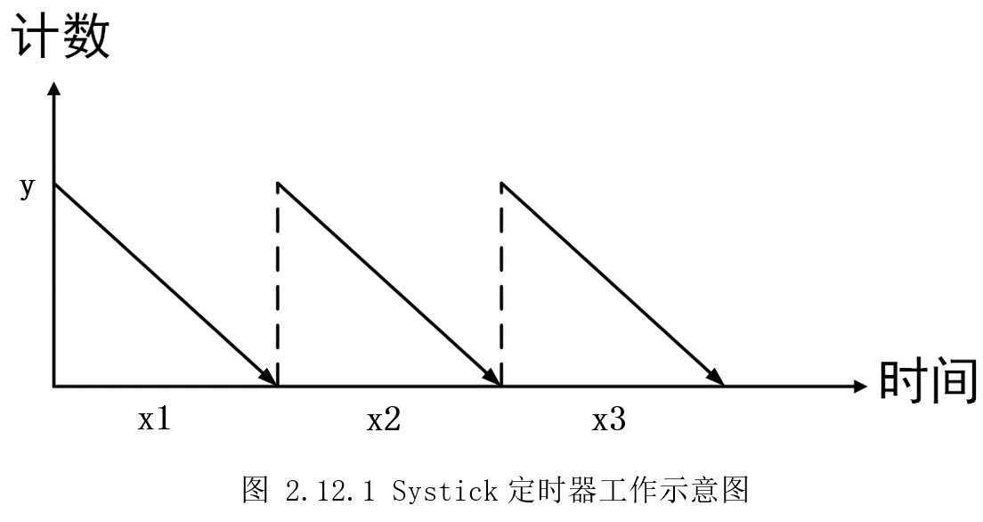 SysTick定时器是一个24位递减定时器,即计数器可以从最大值224开始每个时钟周期减1,当减到0时,会产生一个中断,同时再自动重载定时初值,开始新一轮计数。而这个定时初值,则是我们可以设置的,就可以实现得到指定时间。如下图2.12.1所示,y为定时器初值,然后随着时间增加,值逐渐减小,直至为0,再重新加载初值,如此往复,x1、x2、x3这些时间段,就是我们需要的。