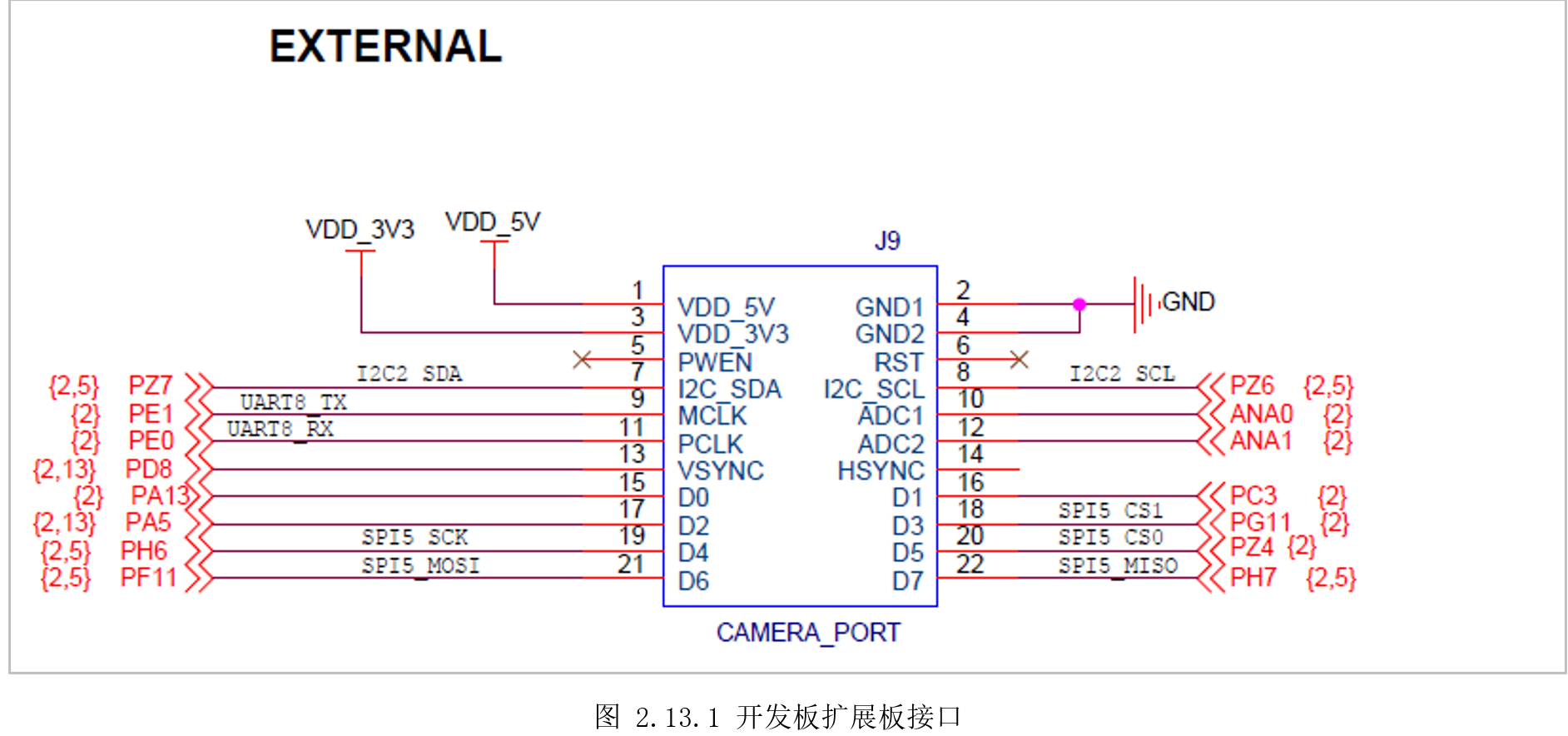 100ASK_STM32MP157将ADC引脚引了出去,在J9的External接口上,如图2.13.1所示,ADC分别是10脚和12脚。
