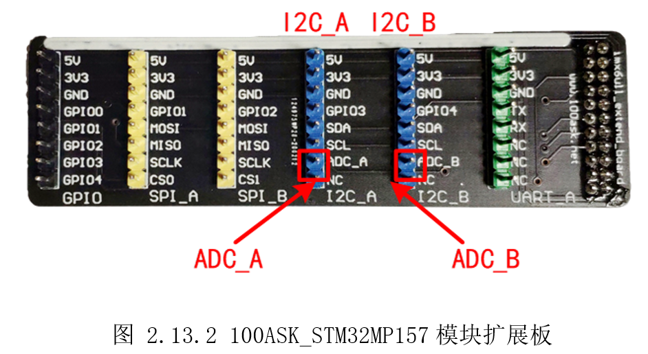 这个座子并不方便实验,因此做了一个转接板,将扩展引脚分类整理引了出来,如图2.13.2所示为100ASK_STM32MP157配套的扩展板。