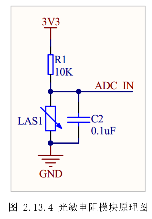 当光敏电阻LAS1受到光照时,阻值会变小,此时它两端的电压会变小;当光照比较弱时,阻值会变大,导致它两端的电压也变大。假设上图中的ADC_IN接到某个GPIO引脚,通过读GPIO引脚只能得到0或1两个值之一,只能判断光照在某个阀值上下。如果使用ADC去读取光敏电阻两端电压,不仅可以知道是否有光照,还能知道光照的强度。