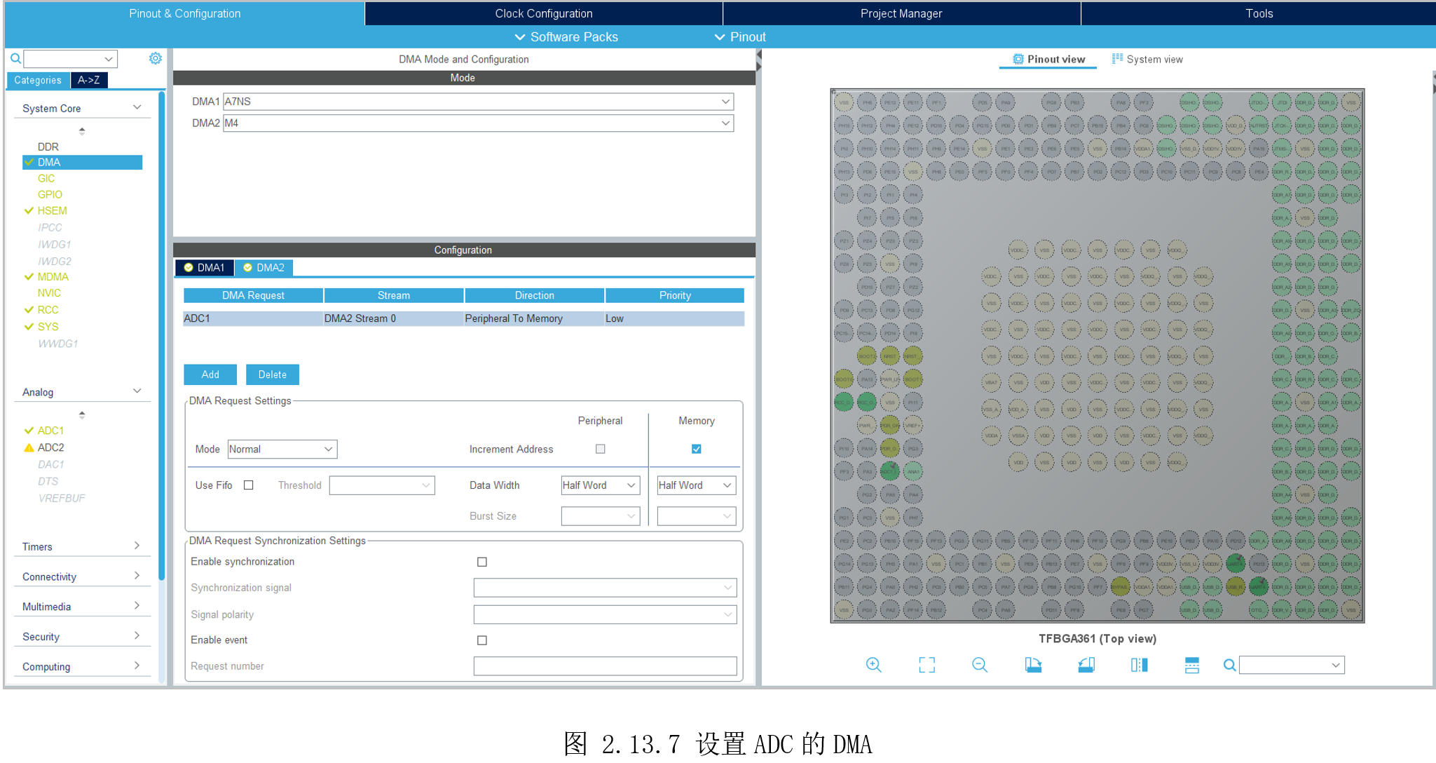 切到DMA标签,在DMA2里“Add”选择“ADC1”,其它默认的配置就行,如图2.13.7所示。使用DMA就无需CPU参与数据的搬运,外设ADC产生数据,就通过DMA自动搬运到内存。在连续采集多次的情境下,将大大降低CPU的负担。