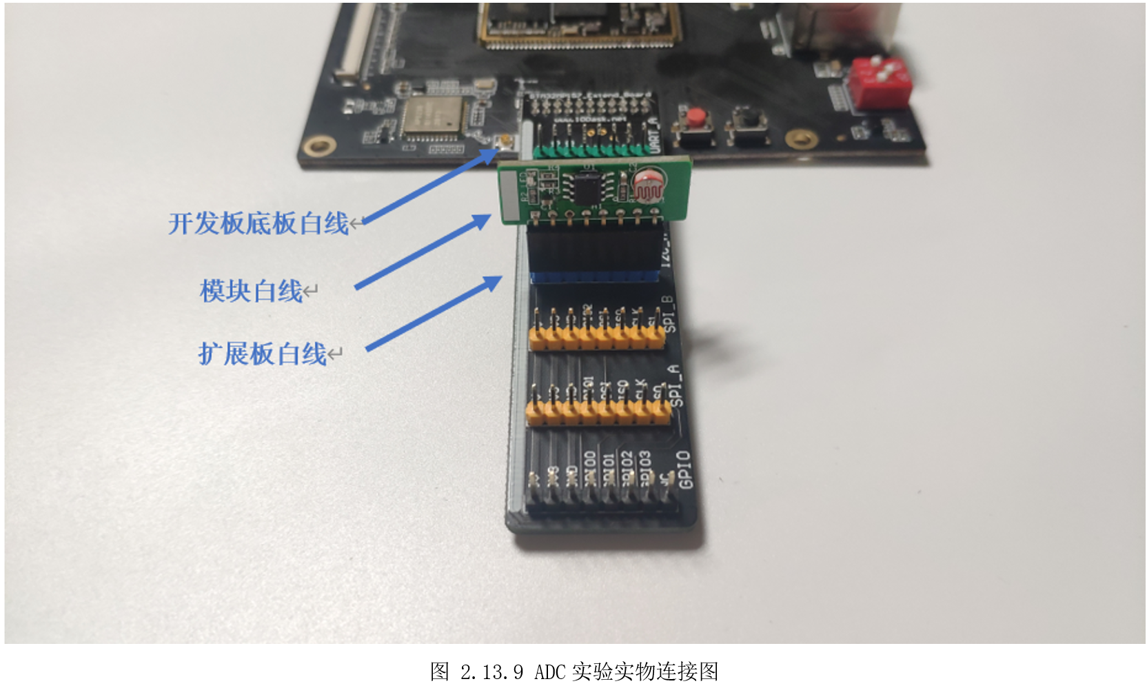 将扩展板接到开发板上,将模块接到扩展板I2C_A(ANA0)上,如图2.13.9所示,注意模块白线、扩展板白线、开发板底板白线,三线朝向一致。。