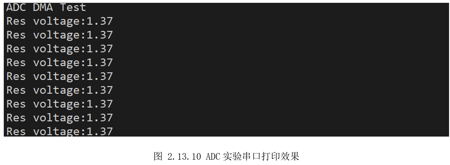 调试运行,可以看到如图2.13.10所示打印,改变光敏电阻光照环境,可以看到打印结果数值也发生变化。