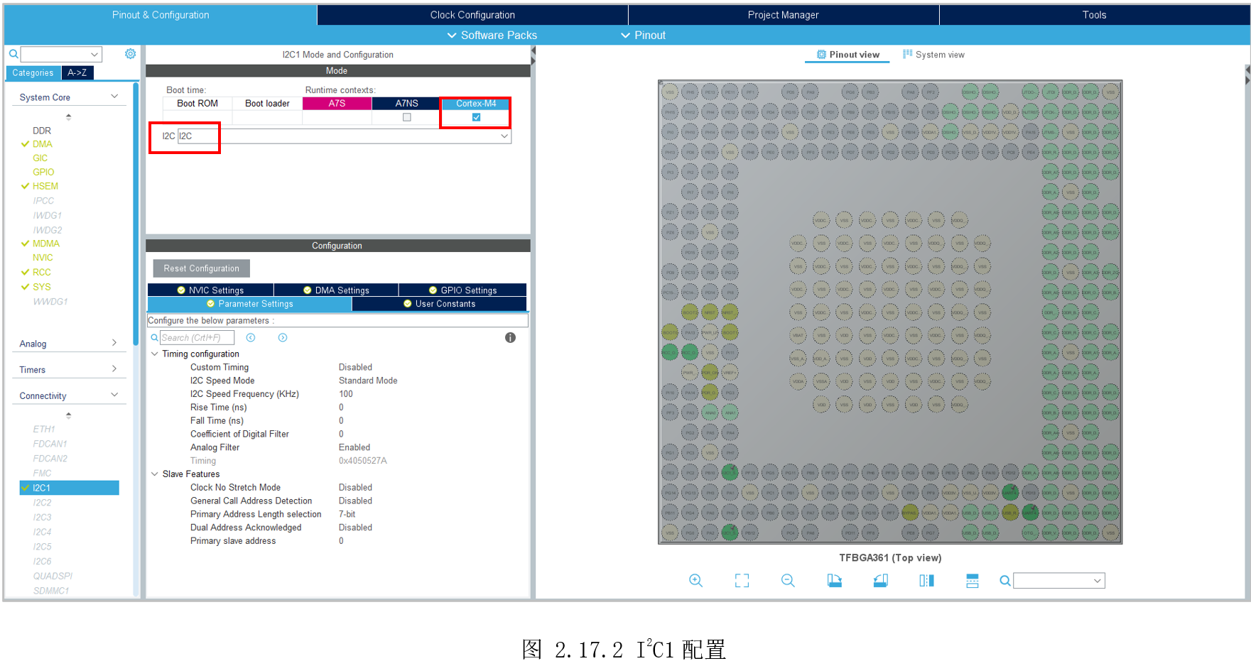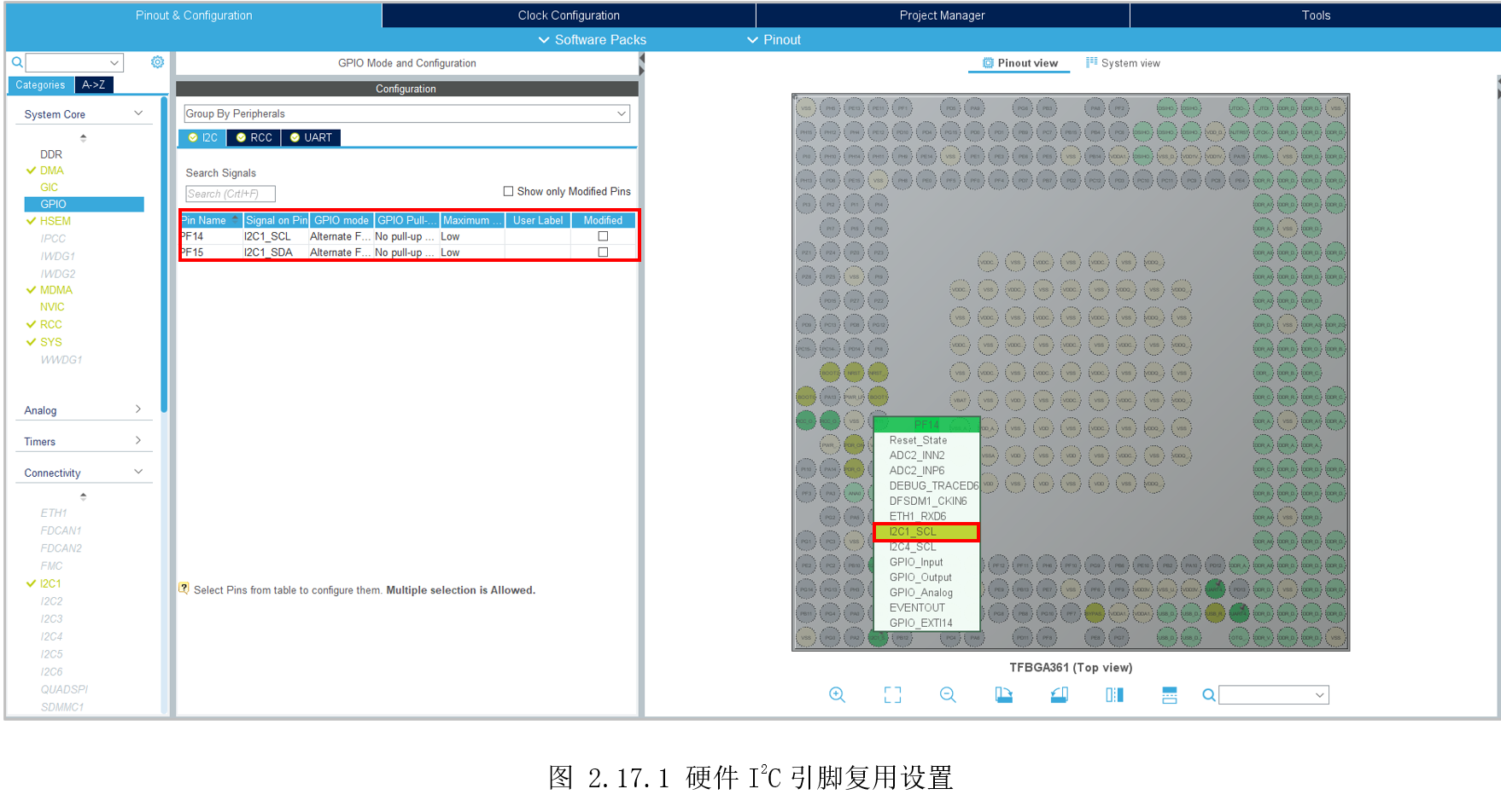 首先配置好MCU系统时钟和串口打印,然后如图2.17.1所示,将PF14、PF15设置为复用I2C1功能。