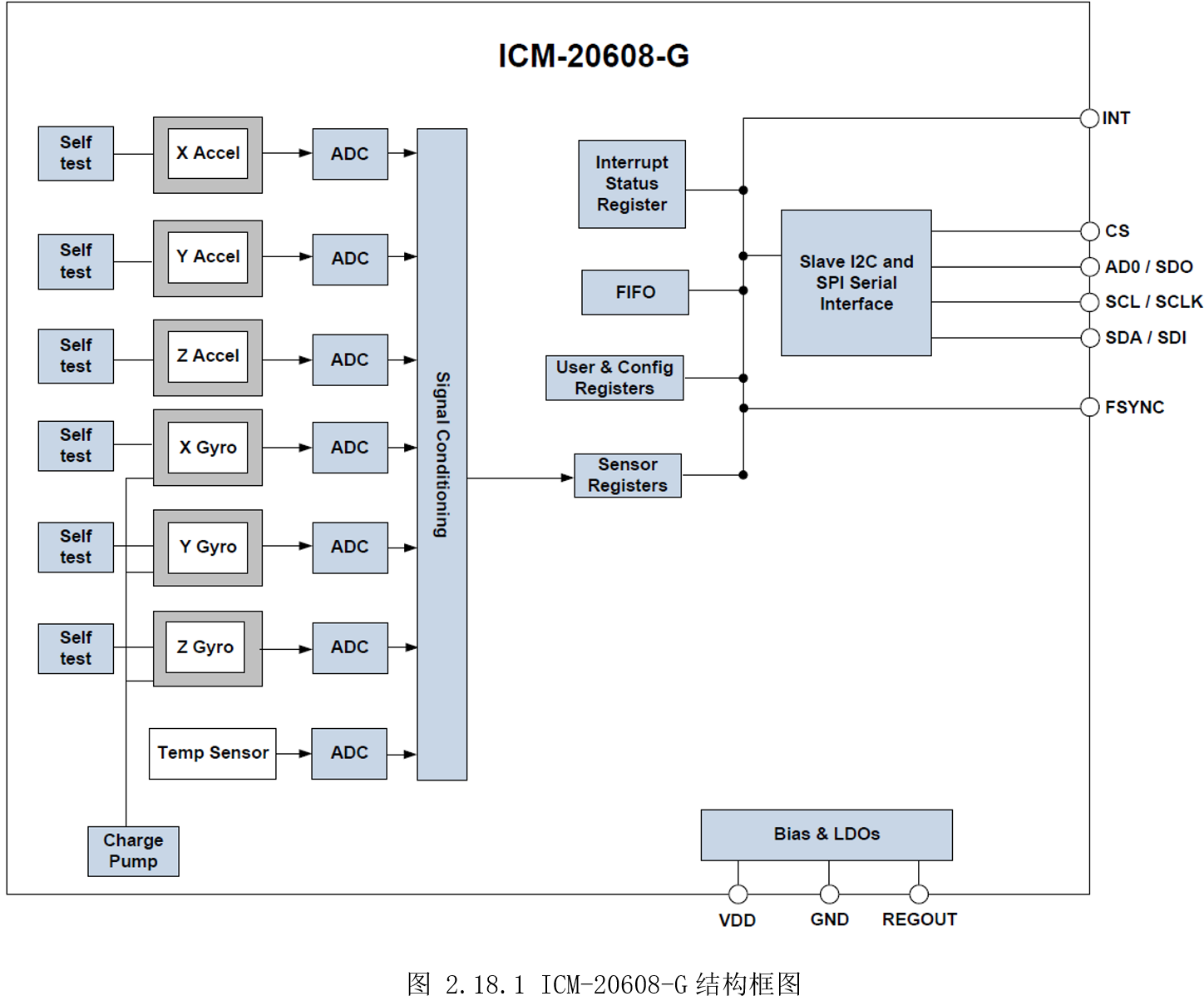ICM-20608-G的内部框图如图2.18.1所示,六轴和温度传感器经过ADC转换保存到内部寄存器,最后通过I2C或SPI向外提供数据。