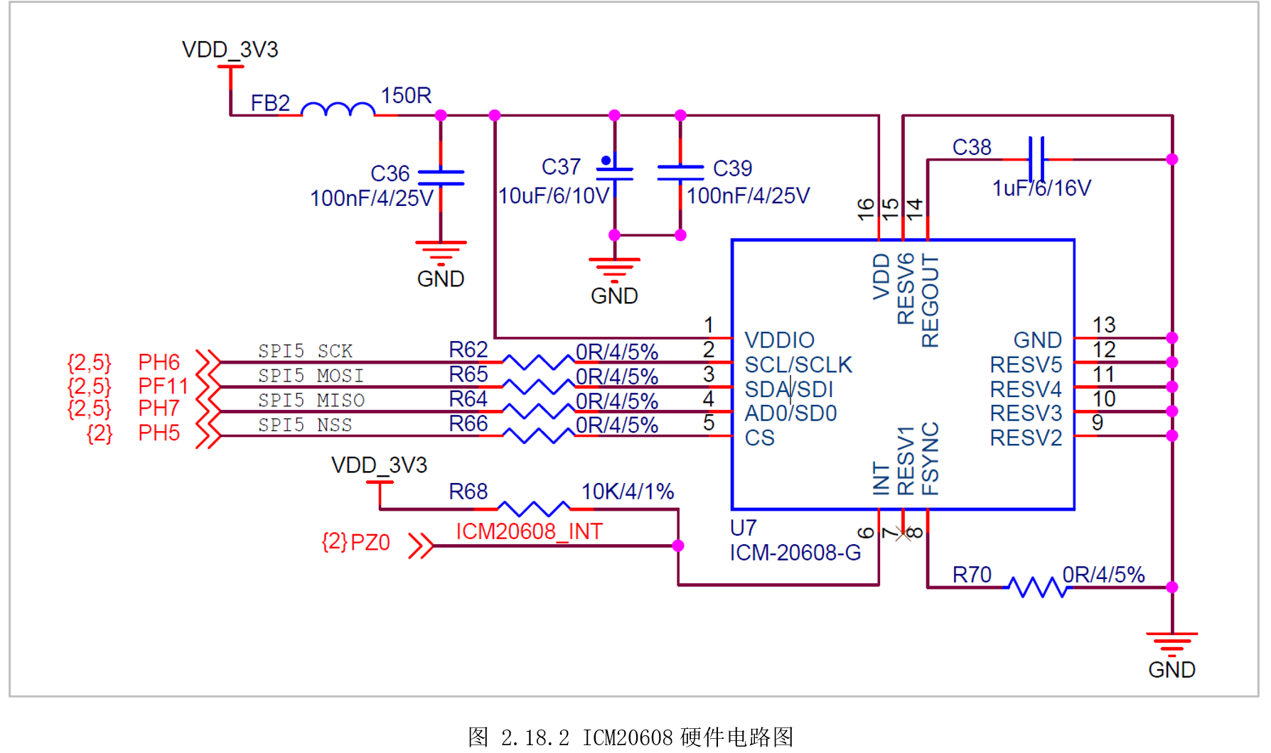 ICM-20608-G在底板的电路图,如图2.18.2所示。接在了SPI5上,这里使用GPIO模拟,可知PH6模拟作为SPI的SCK信号,PF11作为SPI MOSI信号, PH7作为SPI MISO信号,PH5作为SPI NSS片选信号。