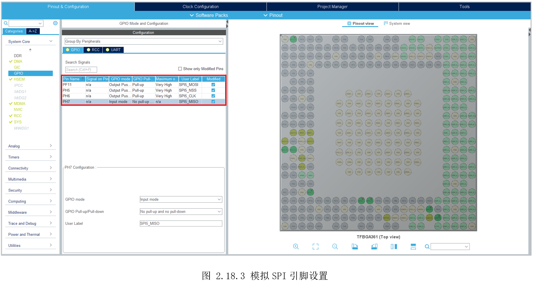 先设置好MCU时钟、串口,接着设置PH6、PF11、PH7、PH5作为普通GPIO,注意PH7是MISO,数据输入引脚,因此要设置为输入模式,其它为输出模式。