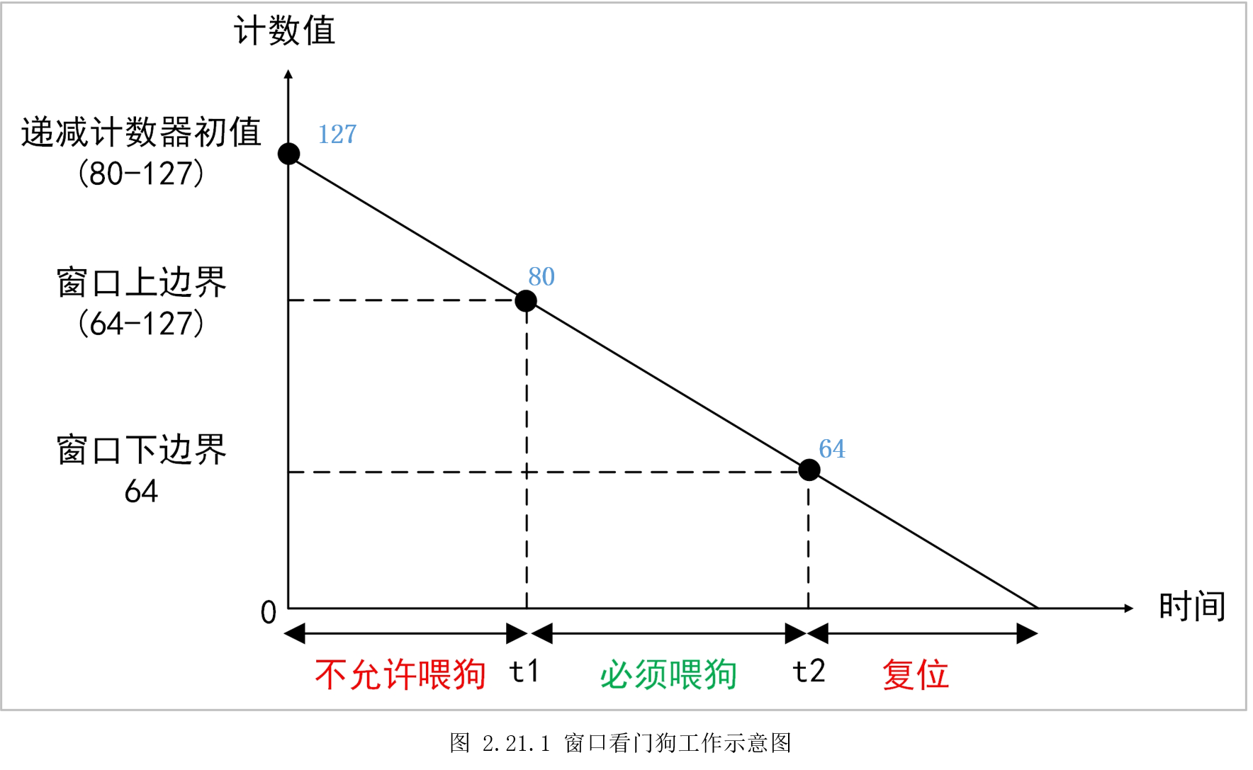 窗口看门狗是一个7位的递减计数器,规定它的范围为80-127。如图2.21.1所示,假设设置这个递减计数器初值为127,随着时间的递增,它的值将逐渐减少。我们还需要定一个窗口上边界,这个上边界位于下边界和递减计数器初值之间,假设为80。那么计数器从127递减到80这个时间段,是不允许喂狗的,一旦喂狗将复位重启;80递减到64这个时间段,必须喂狗;64这个下边界是固定的,一旦递减计数器小于这个值,系统将复位。可以看到,整个过程,我们需要定义两个值,一个是递减计数器初值,一个是窗口上边界值。