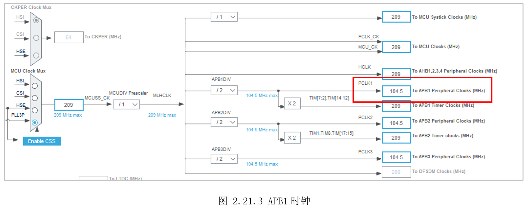 先设置好MCU系统时钟和串口。此时APB1时钟为104.5MHz,如图 2.21.3所示。
