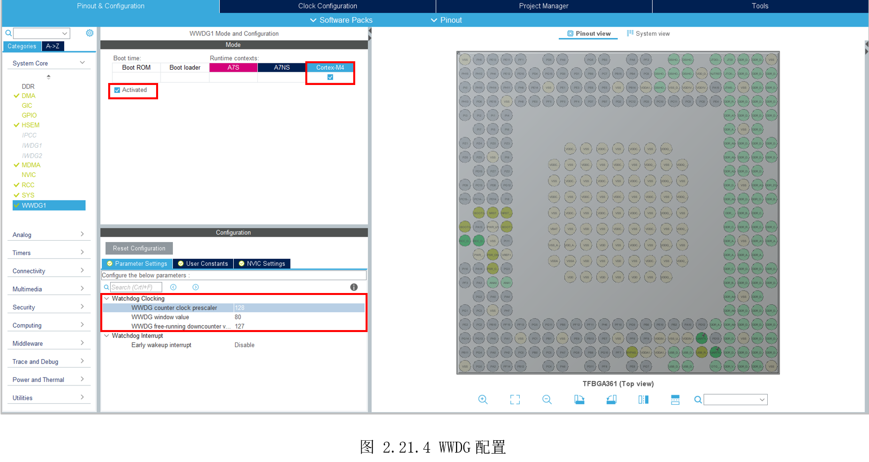 然后切到WWDG1标签,勾选给M4,勾选“Activated”激活。在下面先是设置WWDG时钟分频,也就是前面提到的2WDGTB分频,这里设置为128分频,则此时WWDG实际时钟为104.5MHz/4096/128≈199.3Hz,也就是每秒计数199个数,每个计数花费5毫秒。
