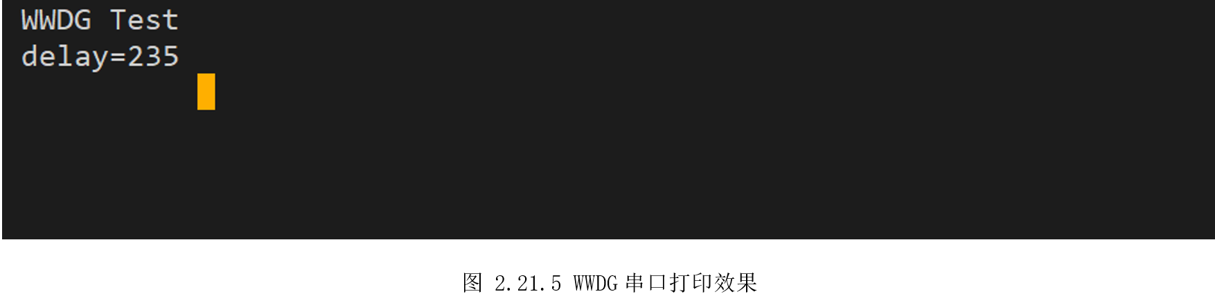 调试运行,串口打印如图2.21.5所示,显示窗口上边界时间为235,和前面理论计算一致。此外,读者可以尝试再小于235ms内喂狗,或者235+80ms后喂狗,测试系统是否会复位。
